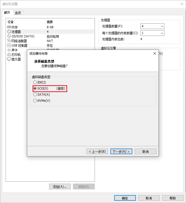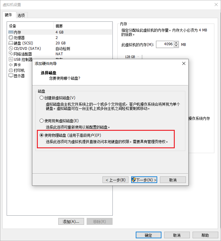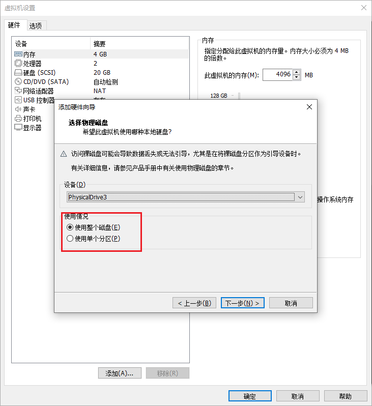 创建完虚拟机不要开机,马上编辑虚拟机设置,之后移除现有的磁盘,并添加新的硬盘。新的硬盘选择SCSI虚拟磁盘类型,之后选择使用物理磁盘(你是高级用户),在弹出的对话框的设备里面选择你之前在准备虚拟磁盘中看到的磁盘号,我这里是physicalDrive3,并选择使用整个磁盘