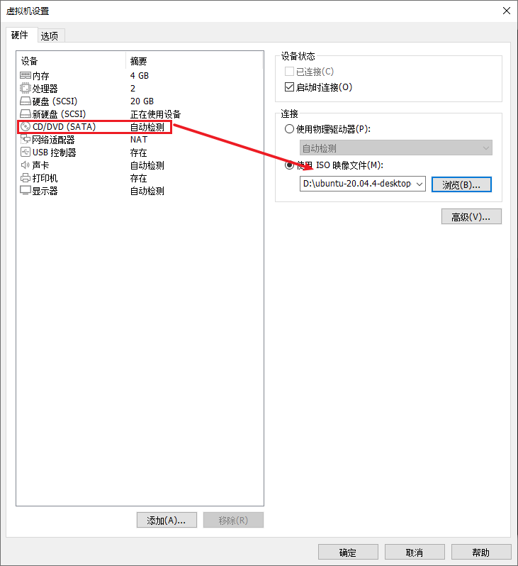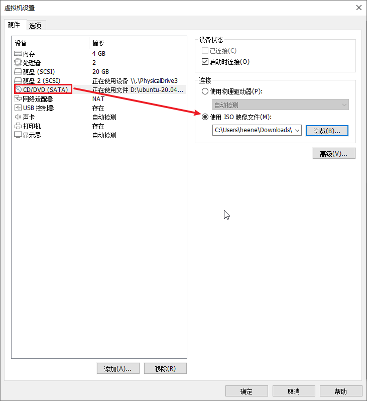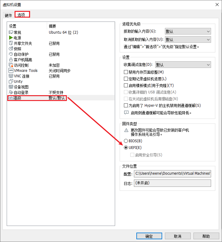 之后会让你选定储存分期信息的地方,随意。然后在CD/DVD一栏里面选择ubuntu的安装镜像文件,我这里是ubuntu-20.04.5.iso。之后进入到选项工具栏,在高级一栏里面的固件类型里面选择UEFI(如果在创建虚拟机的过程中没有选择ubuntu64版本,这里将不可选)。随后正常开机安装系统