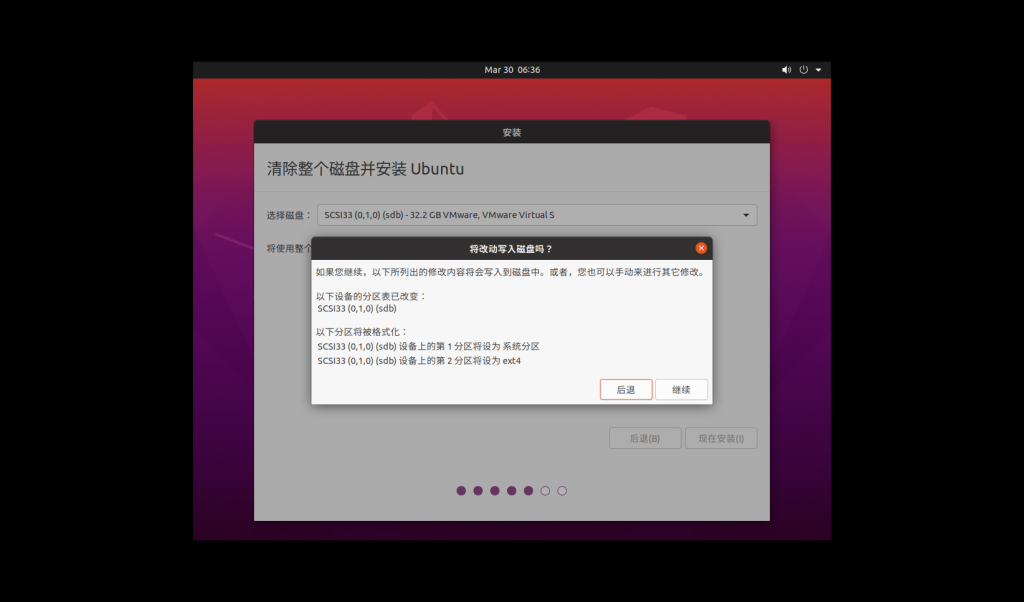 在安装系统过程中会让你选择安装的磁盘,此时你还有一次检查的机会,如果发现磁盘大小和你之前划定的虚拟磁盘大小相差过大你需要警醒你是不是挂载错磁盘了(比如我这里清空磁盘的时候发现虚拟磁盘大小为32GB,这里ubuntu是以1000MB/GB来计算的,正常时1024MB/GB,所以是正常的)