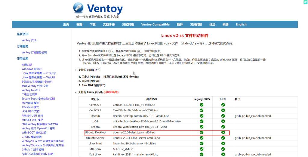 安装完成之后还需要去Ventoy官网的插件列表里面找到Linux vDisk 文件启动插件,确保你要安装的系统在支持的Linux发行版里面。之后拉到最下面下载vtoyboot脚本备用(该脚本在github中是以iso格式出现的)