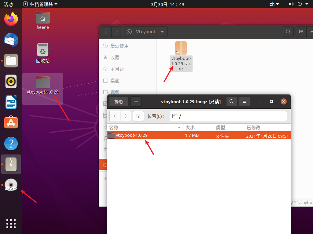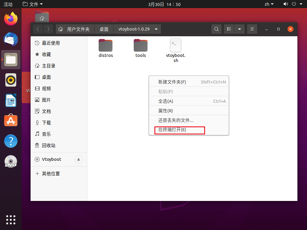 安装完成之后,关机,之后把之前挂载的DVD改成vtoyboot的iso文件,打开之后将vtoyboot解压到桌面,然后以root权限执行里面的脚本 sudo bash vtoyboot.sh 脚本执行完之后,使用 poweroff 命令关机。