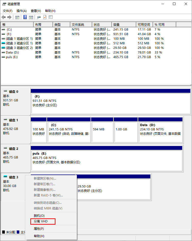 重新打开磁盘管理器,右击虚拟磁盘,选择分离VHD,之后指定路径,将虚拟磁盘变成文件。之后,原本的文件名是.vhd现在需要改成.vhd.vtoy并拷贝到之前准备好的U盘之中。之后关机重启,选择U盘启动,使用U盘进入系统。