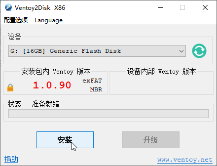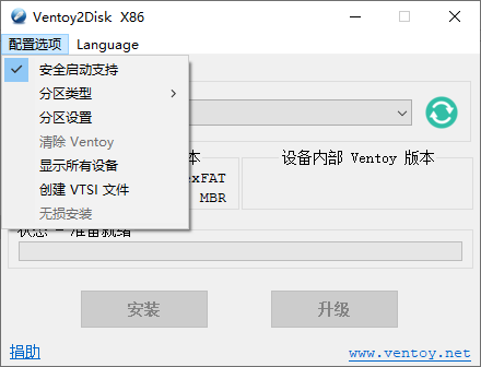 点击 Ventoy2Disk.exe 打开软件,并在配置选项工具栏下面勾选上安全启动支持,之后选择你准备要安装系统的Upan并点击安装。